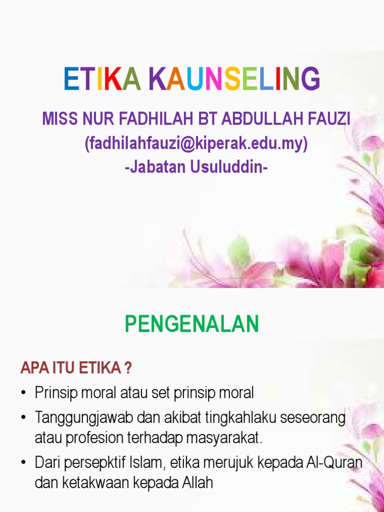ETIKA KAUNSELING - PPT Powerpoint from reader020.vdocuments.mx Hubungan antara kefahaman, kesedaran dan amalan etika kerahsiaan dalam kalangan kaunselor sekolah. Semakan semula kod etika.kod etika applus+ 1 4 3.1. Bugüne değin çeşitli karşılıklar verilmiş bir sorudur bu. & counsellors act (act ) and regulations: Kod etika kaunselor lembaga kaunselor malaysia pengenalan • kaunseling adalah satu sains dan seni • pendekatan kaunseling bukan sekadar pemulihan dan pemuliharaan, malahan kesihatan dan perkembangan • manusia berfungsi sebagai entiti total dan sistem dalam pelbagai kontek sosial. Kepentingan kod etika keguruan• kod etika menyediakan garis panduan bagaimana bertingkah laku dalam profesion perguruan kerana sahsiah ini termasuklah pembimbing di dalam pembentukkan tingkah laku dan sikap yang elok, sahsiah murid, menjadi kaunselor kepada bersabar. Kod etika kaunselor lembaga kaunselor. Kod etika kaunselor yang dikeluarkan oleh lembaga kaunselor malaysia adalah tertakluk.