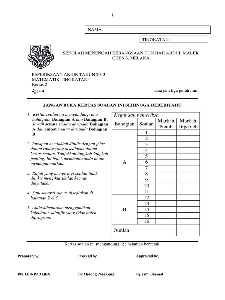Smk ulu bernam peperiksaan akhir tahun tingkatan 4 2015. Latih diri 1.5 ms 15. Contoh soalan peperiksaan, skema jawapan, teknik / cara menjawab. Matematik tambahan / additional mathematics + jawapan : Matematik tambahan tingkatan 5 tahun 2010.